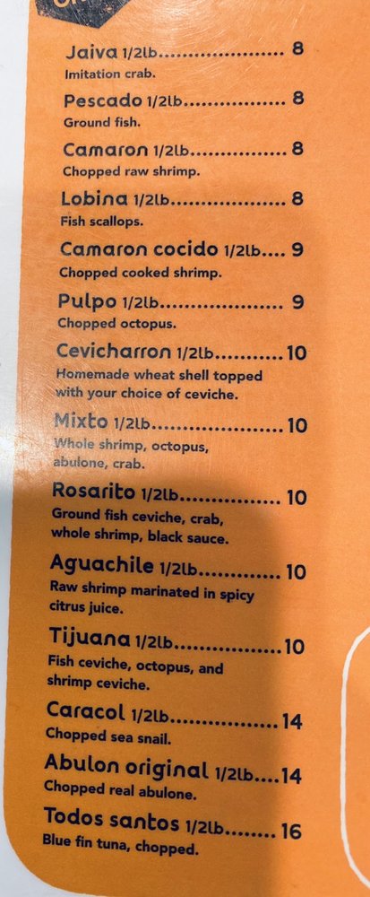 Aguachile, lobina, sea snail, octopus, abulone, whole shrimp.