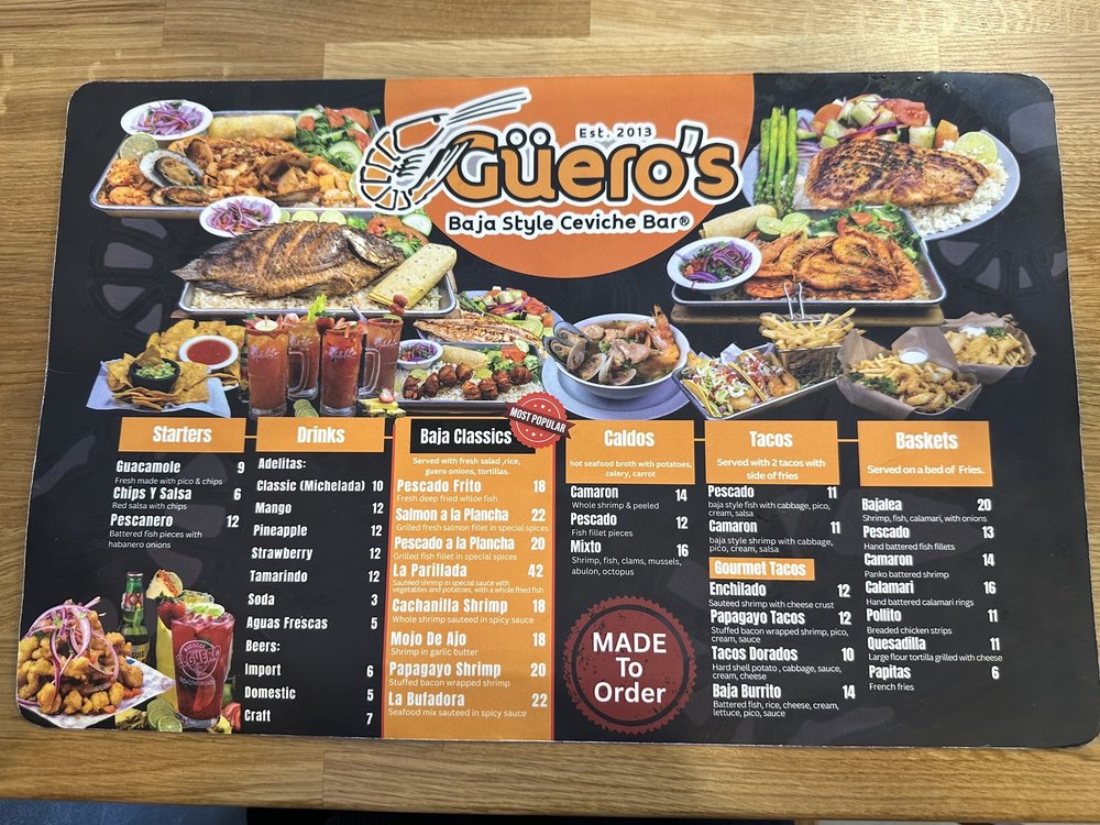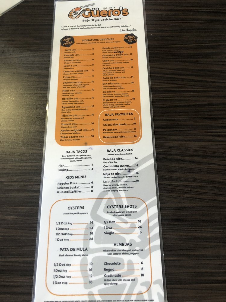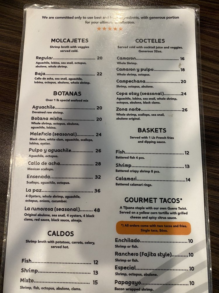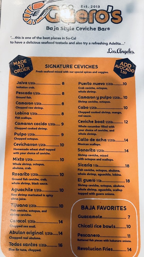 Mariscos El Guero Baja Style Ceviche Bar offers a delightful menu filled with fresh and flavorful seafood dishes. From their signature ceviches like the El Guero with shrimp, octopus, and abalone, to their tasty tostadas loaded with marinated fish and shrimp, each dish is expertly prepared and bursting with delicious flavors.