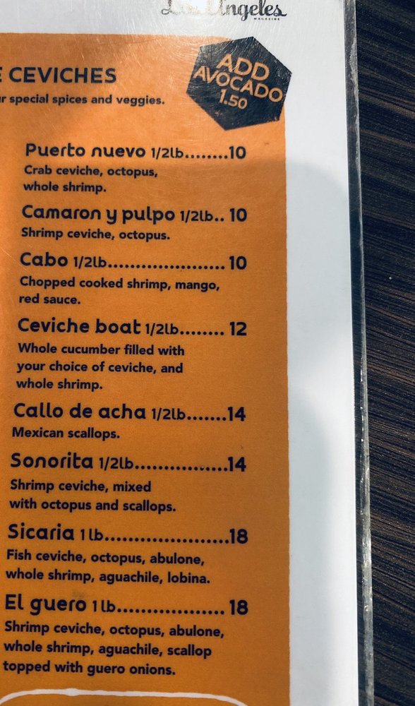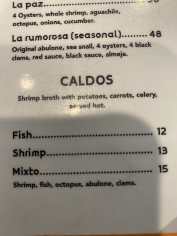 Callo de acha, sea snail, aguachile, lobina, octopus, abulone, whole shrimp.