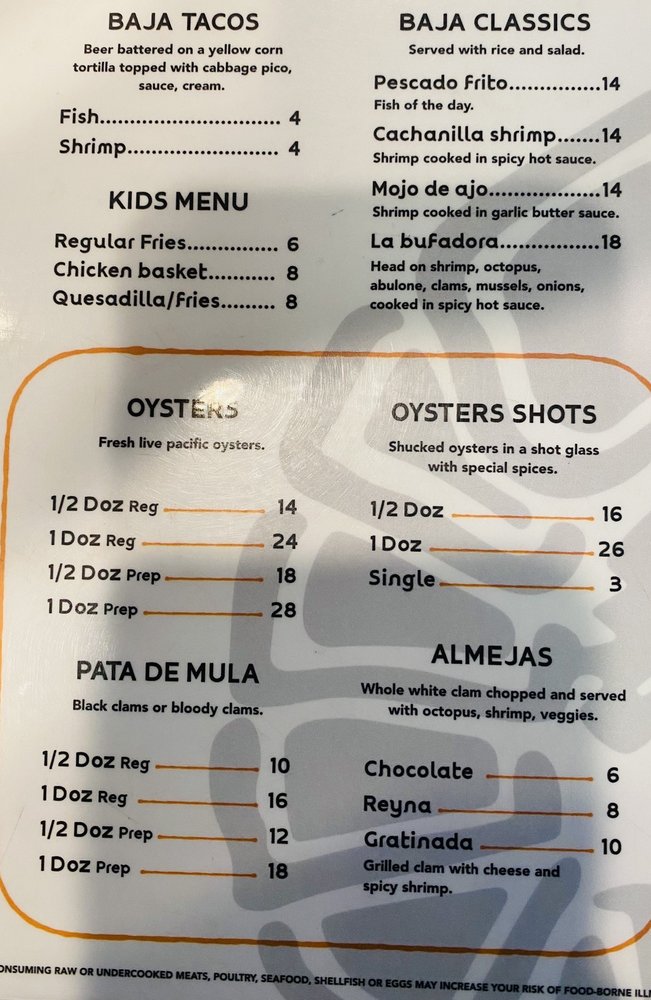 Mexican scallops, & sea snail. Marinated shrimp & fish, abalone, cocktail shrimp, octopus, bloody clams, oysters, crab claw. Baja fresh flavor in every bite.